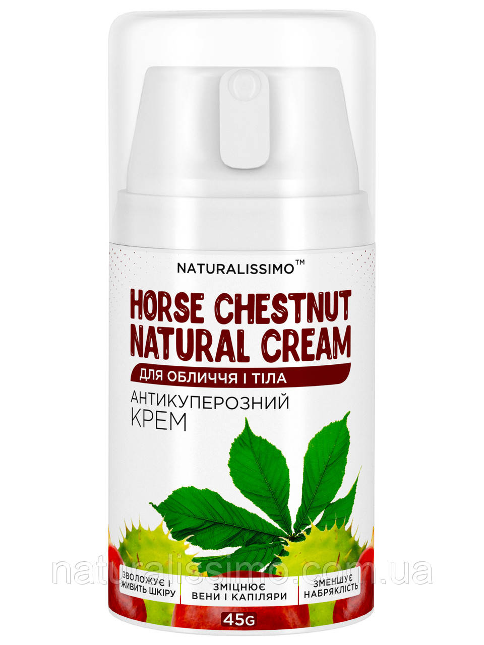 Компанія «Натураліссімо» пропонує купити антикуперозний крем із каштаном у зручному пакованні з дозатором по 45г. Ви можете оформити замовлення на сайті або зателефонувати за телефоном у разі необхідної консультації наших фахівців.